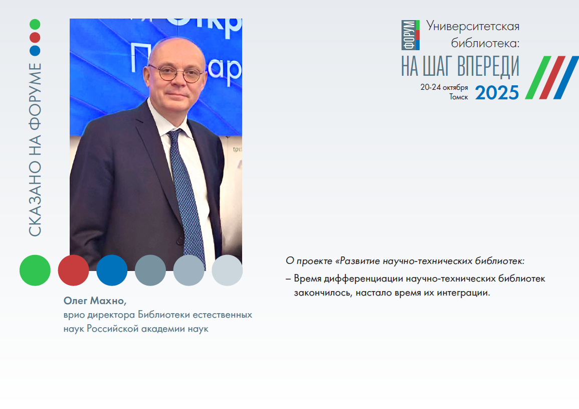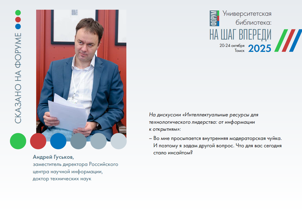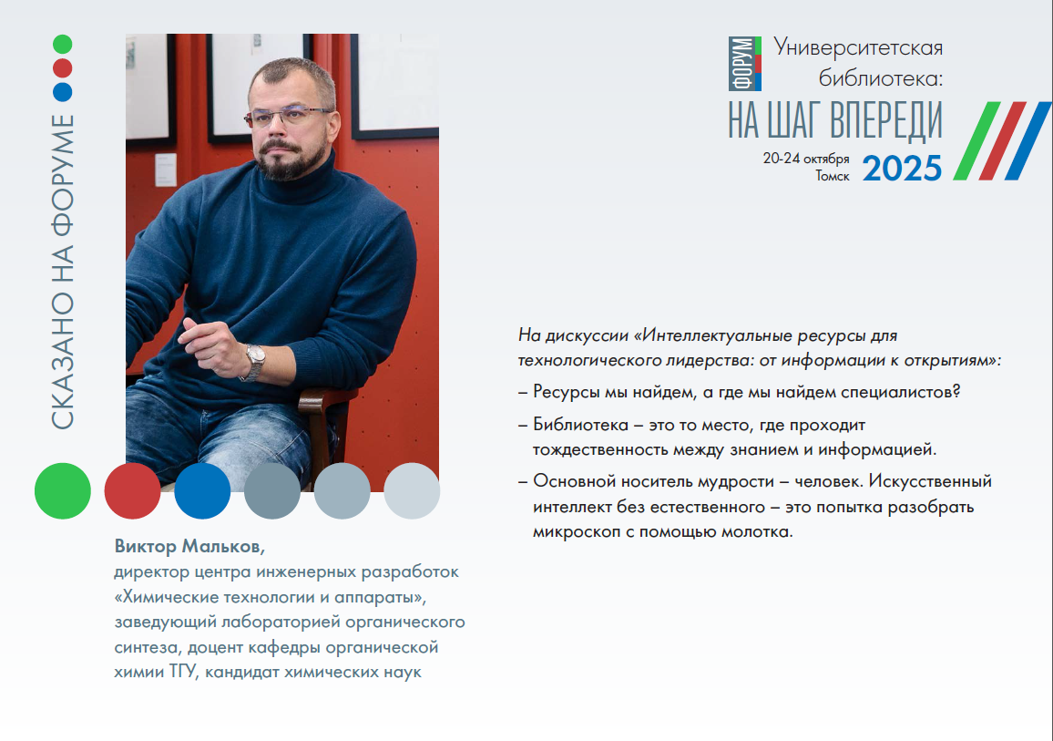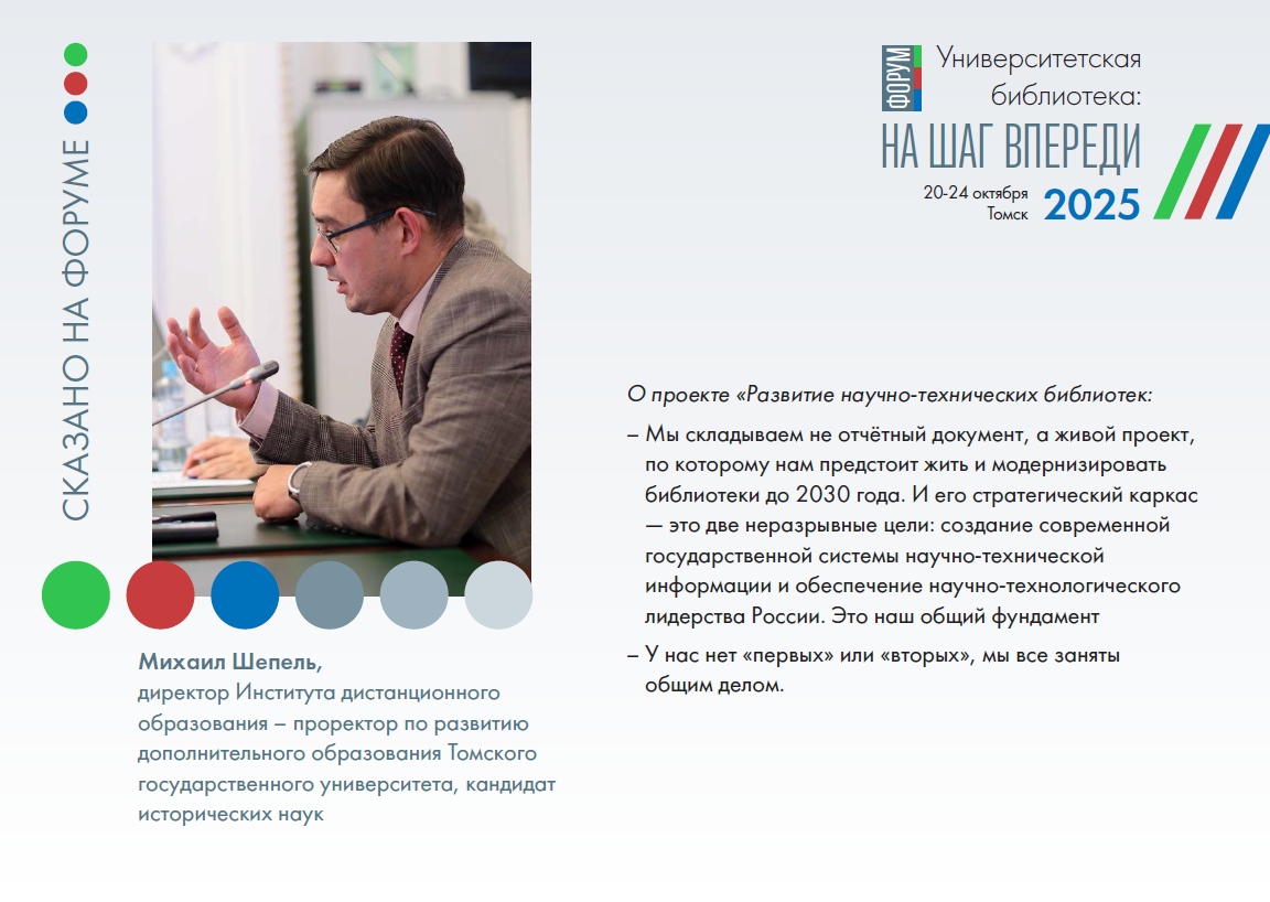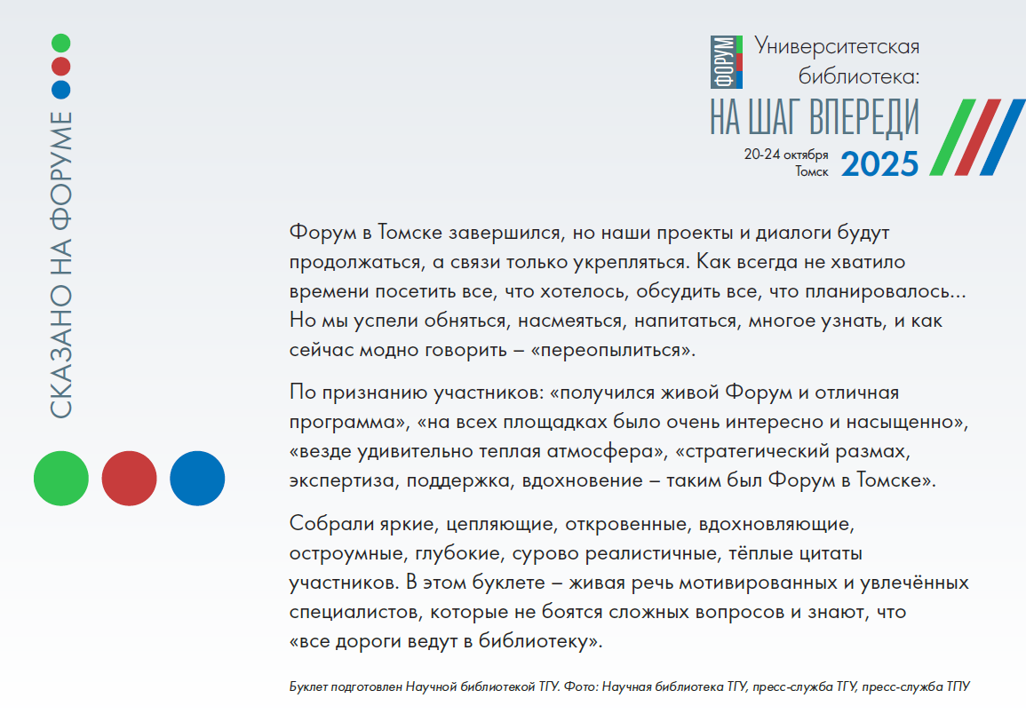 По итогам Форума «Университетская библиотека: на шаг впереди» вышел сборник цитат участников. В нем собраны самые разные высказывания: яркие, цепляющие, откровенные, вдохновляющие, остроумные, глубокие, сурово реалистичные. На страницах сборника звучит живая речь мотивированных и увлечённых специалистов, которые не боятся сложных вопросов и знают, что «все дороги ведут в библиотеку». Буклет подготовлен Научной библиотекой Томского государственного университета. Руководитель проекта: Лариса Курбатова, заведующая отделом социокультурных коммуникаций НБ ТГУ. Координатор: Дарья Бирюкова, ведущий методист отдела библиотечного взаимодействия и технологии НБ ТГУ. Дизайнер: Валерий Кузнецов, главный специалист отдела социокультурных коммуникаций НБ ТГУ. Фото: Оксана Мишевич, НБ ТГУ; Владимир Костенков, пресс-служба ТГУ; Максим Ивлев, пресс-служба Томского политехнического университета. Добавим, что Всероссийский форум с международным участием «Университетская библиотека: на шаг впереди» проходил в Томске с 20 по 24 октября. Участники не просто обменивались опытом, но и формировали идеи и актуальные подходы для стратегий развития библиотек, прогнозирования запросов университета и пользователей, разработки эффективных сервисов, профессионального развития, а также для освоения университетскими библиотеками новых ролей в достижении технологического лидерства страны.